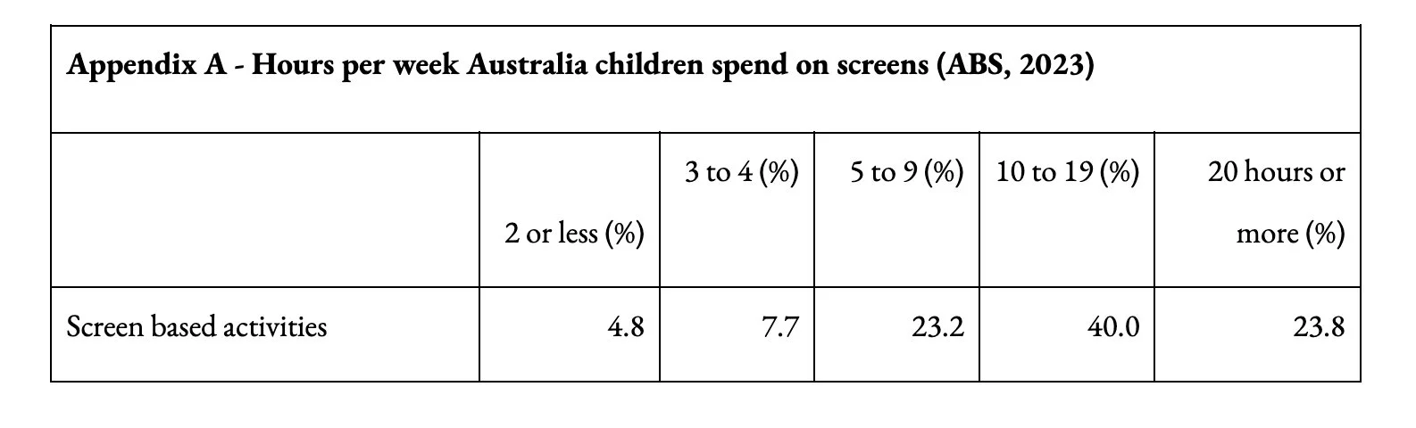 Appendix A - Hours per week Australia children spend on screens (ABS, 2023)